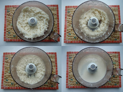 放進食物調理機攪打,調理機裡不可有水。份量請依自己的調理機大小斟酌,我的大約放300g椰子片剛剛好,打完體積會變很小。注意椰子片會從大片變成小碎片,產生黏性,不時刮一下四壁,最後成為柔滑的液態 (圖片從左上→右下→左下→右下)。依每個人的機器強度攪打時間長短也不同,我大約打15分鐘。記得中間要停下來讓機器休息以免過熱。椰子脂可以用來做烘焙時的油脂材料,或加在咖哩裡,用途很廣。打完裝進玻璃罐室溫保存,冷卻後會凝固很正常,要用的時候挖出來隔水加熱融化即可。